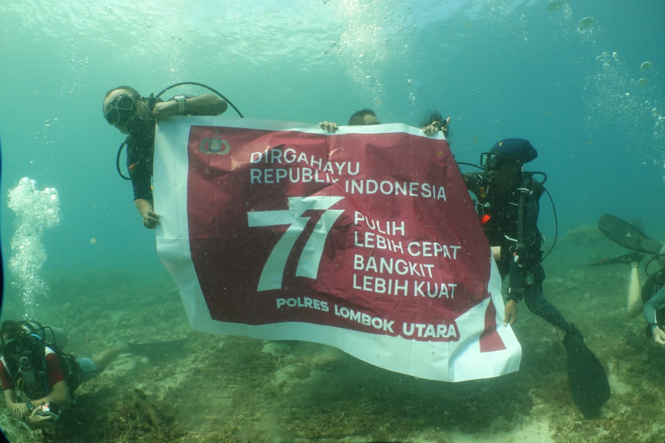 Wakapolres Lombok Utara Kompol Samnurdin, S.H usai pengibaran dan pemasangan bendera merah putih didasar laut kepada awak media mengatakan, upacara penghormatan dan pemasangan bendera merah putih di dasar laut ini merupakan salah satu kegiatan menyemarakkan HUT RI ke-77.