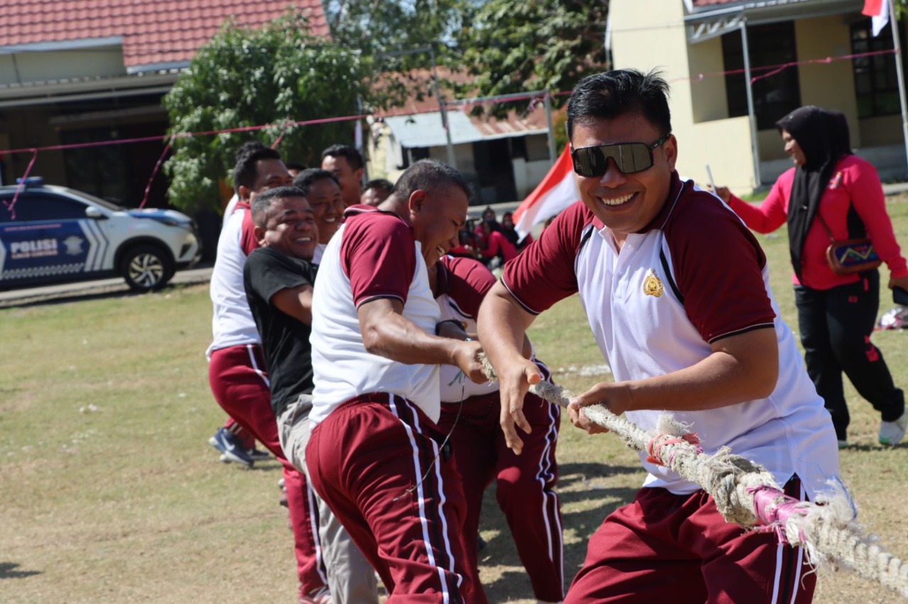 KOTABIMA ,infoaktualnews.com _ berbagai lomba digelar Polres Bima Kota, menyemarakan HUT ke 77 Republik Indonesia. , Selain pertandingan Volley Ball antar fungsi lomba lain yang digelar, lomba makan kerupuk antar anak anggota Polri Polres Bima Kota, lomba lari karung antar PJU dan anggota Polres Bima Kota, lomba tarik tambang antar Bhayangkari vs Polwan dan lomba joget balo.