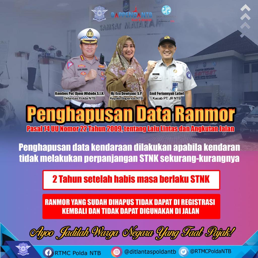 MATARAM ,infoaktualnews.com _ Korps Lalu Lintas (Korlantas) Polri segera mengimplementasikan aturan penghapusan data Ranmor STNK yg sdh tidak berlaku dan kemudian 2 tahun dia tidak bayar pajak kendaraannya secara berturut-turut. Aturan itu sudah termaktub dalam pasal 74 Undang-Undang Nomor 22 Tahun 2009 tentang Lalu Lintas dan Angkutan Jalan (LLAJ).