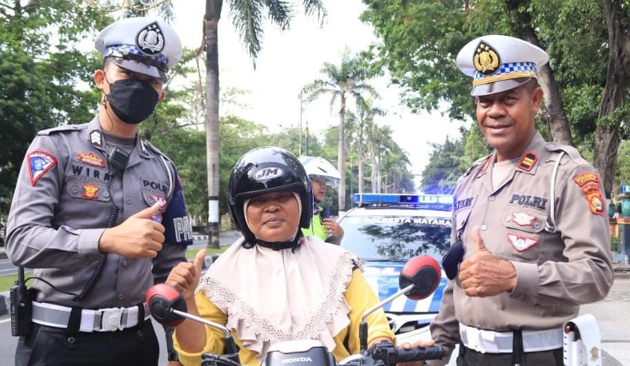 Sekaligus membagi-bagikan Helm gratis kepada Pengguna jalan roda 2 yang tertib berlalu lintas dan kelompok masyarakat yang sedang berkumpul seperti di Lapangan Sangkareang Mataram dan Taman Udayana, tandas Kompol Bowo