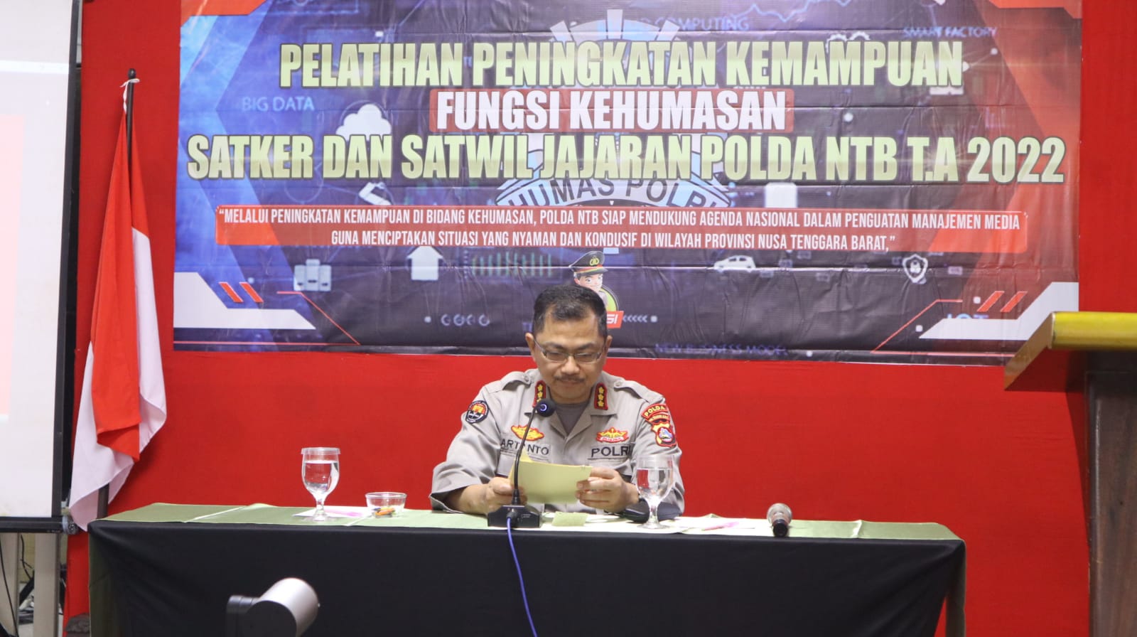 Kepala Bidang Humas Polda NTB Kombes Pol Artanto SIK dalam sambutannya pada acara pembukaan pelatihan tersebut mengatakan kemampuan dibidang Kehumasan perlu tetap di upgrade seiring perkembangan ilmu dan teknologi seperti sekarang