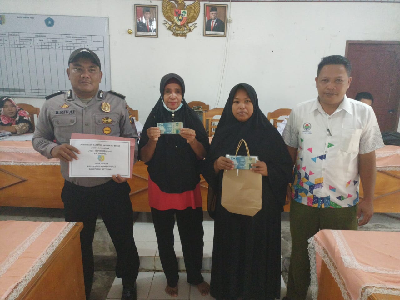Kapolsek Medang Deras AKP M. Syafii melalui personil yang melaksanakan tugas Aiptu R.Rivai mengatakan jumlah penerima bantuan tersebut sebanyak delapan puluh lima orang, dengan jumlah bantuan sebesar Rp 900.000 Rupiah, terhitung tiga bulan.