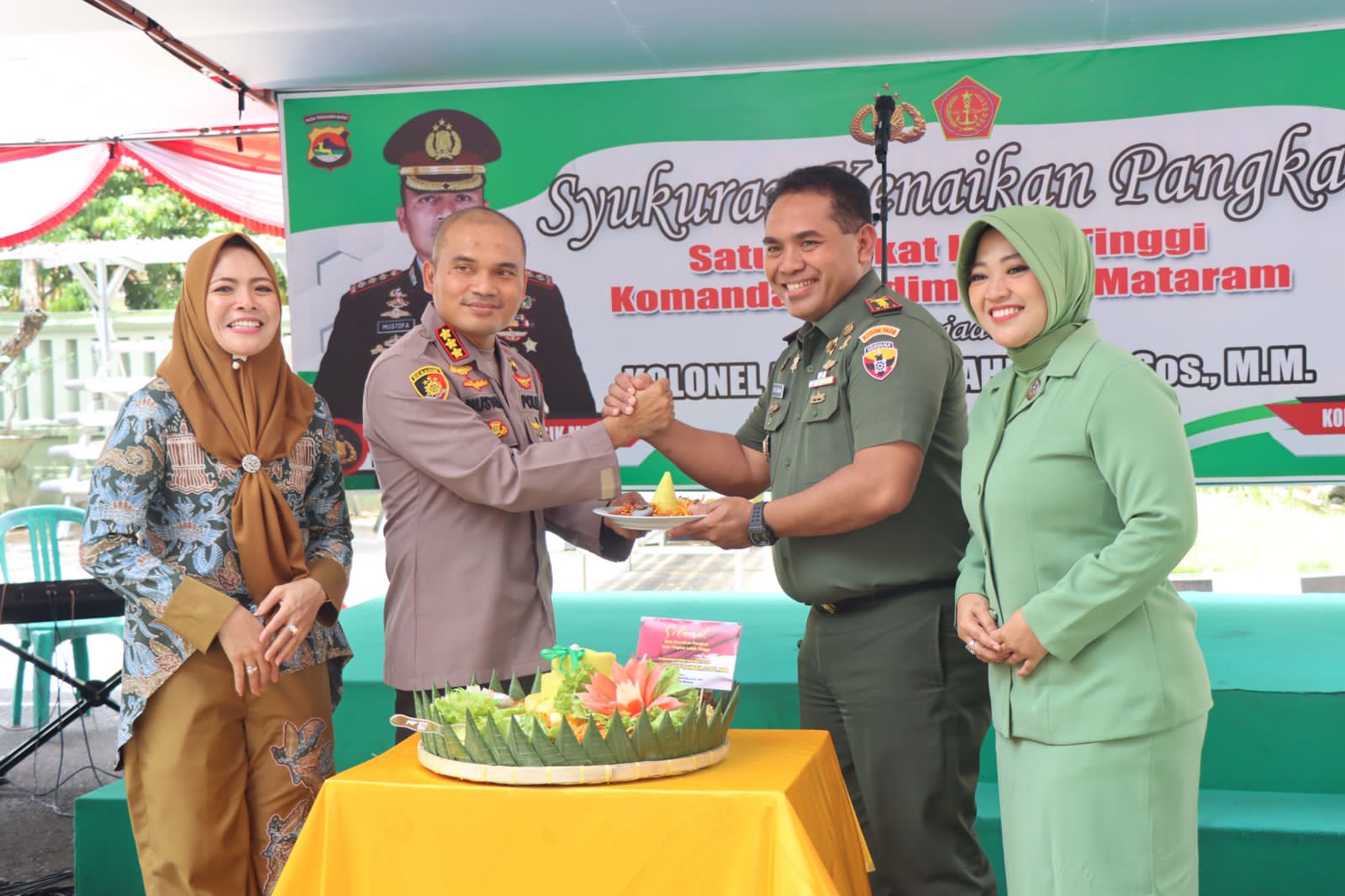 MATARAM infoaktualnews.com _ Dalam rangka kenaikan pangkat satu tingkat lebih tinggi Komandan Kodim 1606/Mataram menjadi Kolonel Arm Arif Rahman , S.Sos, M.M., Polresta Mataram memberikan kejutan dengan menggelar Syukuran bertempat di Mako Kodim 1606 Mataram, Jalan Pejanggik, Kota Mataram. Sabtu, (01/09/2022)