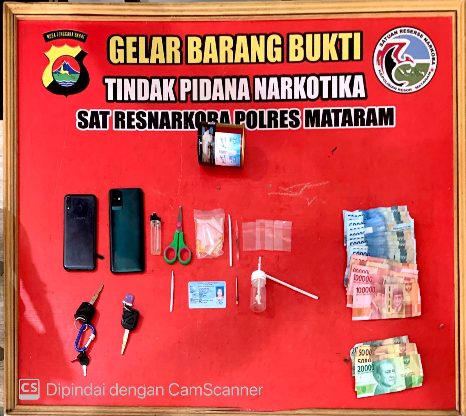 Lanjut oleh Kasat Narkoba polresta Mataram bahwa hasil penggeledahan juga turut diamankan beberapa alat konsumsi sabu seperti pipa kaca sedotan modifikasi , HP kemudian diamankan sejumlah uang diduga hasil penjualan sabu.