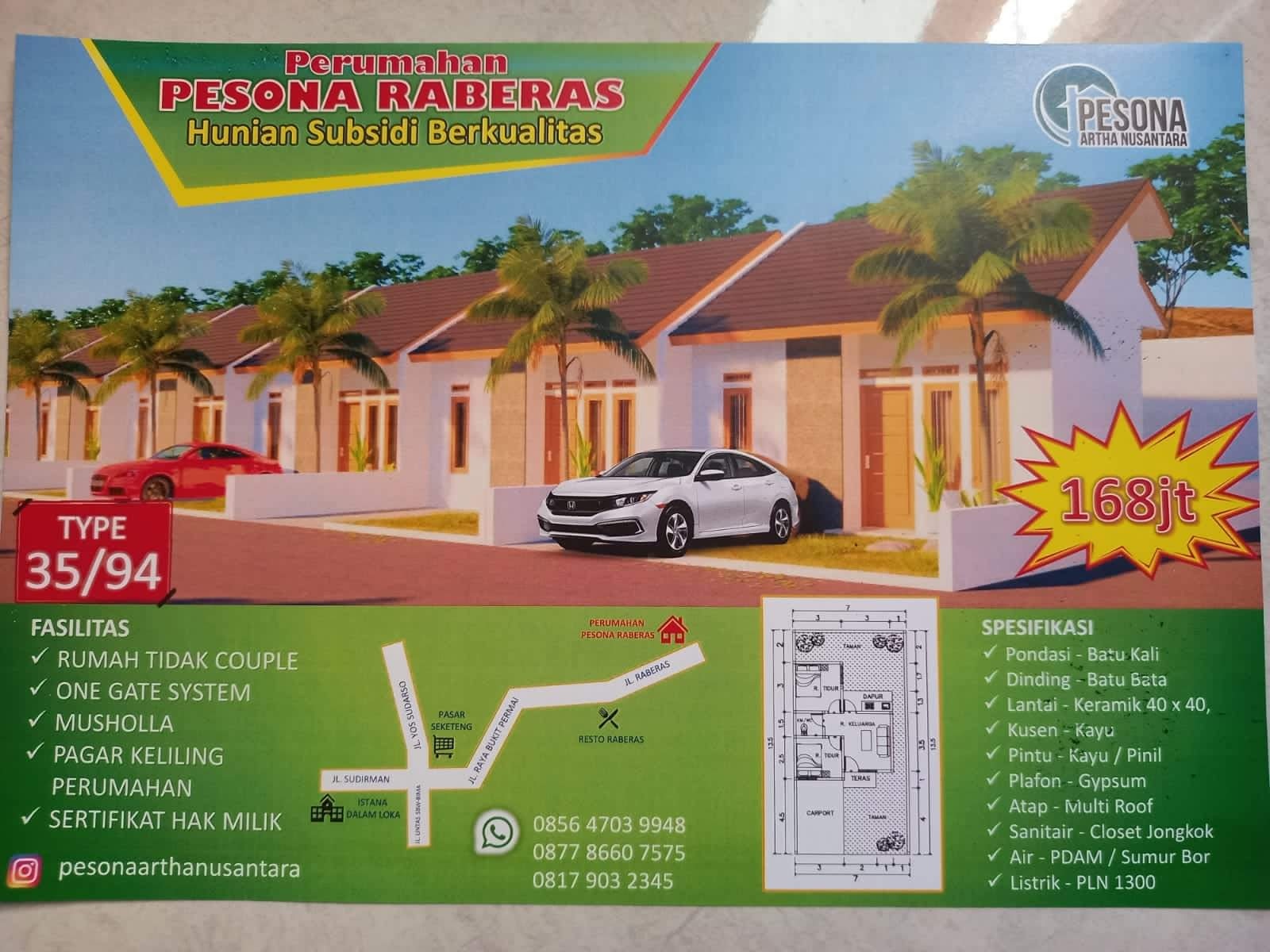 Perumahan Pesona Raberas menyediakan Type 35/94. Dimana perumahaan ini terjangkau dari pusat perekonomian (Pasar) Pendidikan (Sekolah), Kesehatan (Rumah Sakit) dan Lain sebagainya.