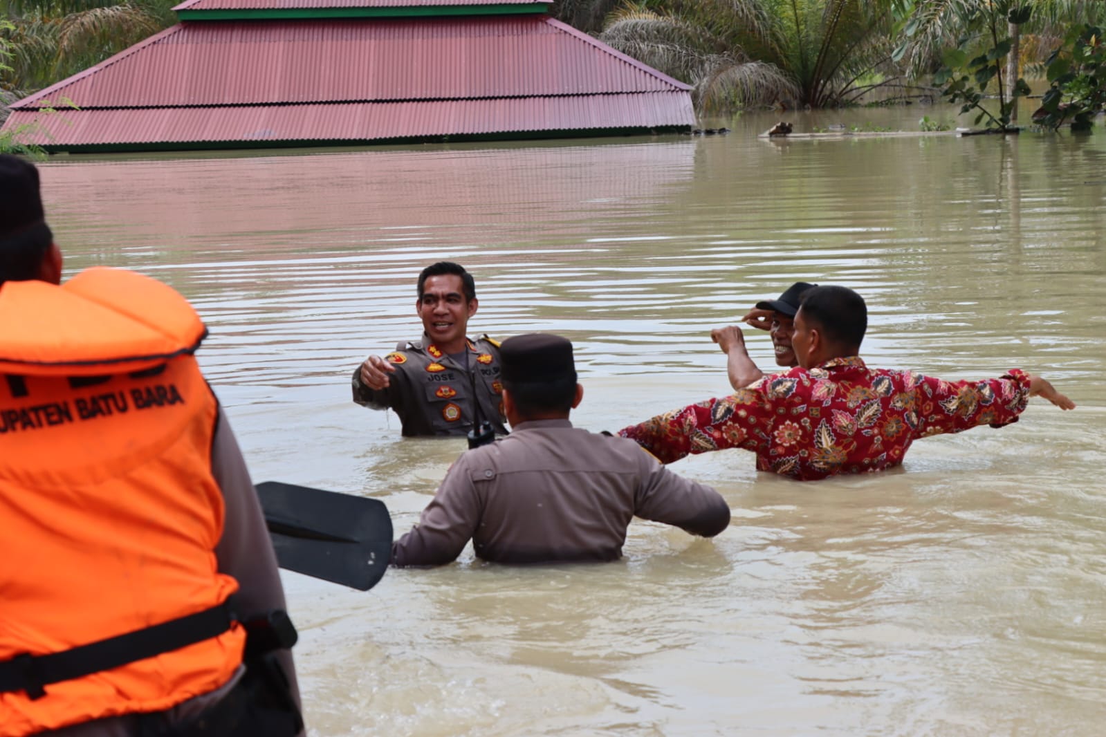 Tak hanya rutin melakukan pemantauan di titik terparah lokasi banjir, Kapolres Batubara AKBP Jose D.C Fernandes juga memberikan bantuan sosial dan pendirian posko siaga bencana, juga mendatangi langsung warga yang bertahan di rumahnya dengan cara mengarungi luapan banjir yang hampir seleher orang dewasa.