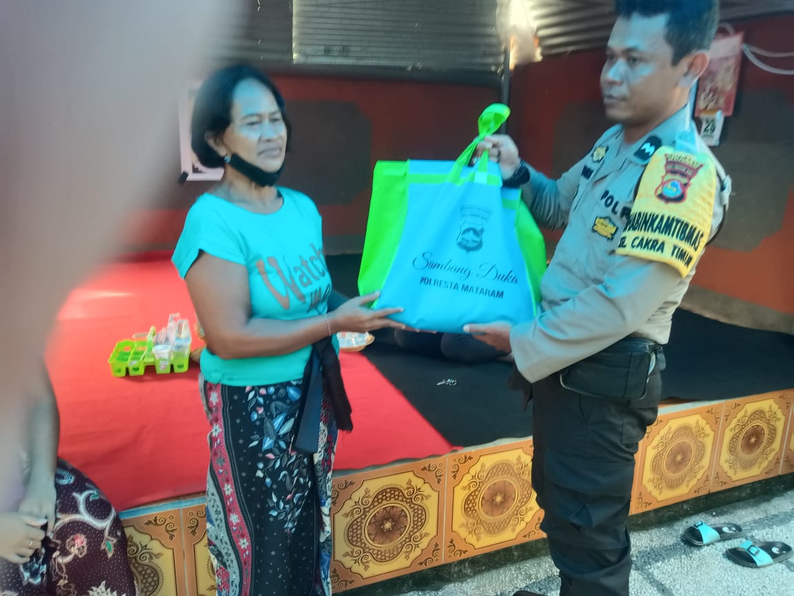 Tampak Bhabinkamtibmas Kelurahan Cakranegara Timur sebagai wujud bentuk peduli memberikan bantuan sembako dan mengamankan sampai selesai prosesi upacara Ngaben alm. Wayan Brata di Jalan Narada, Lingkungan Karang Siluman Selatan, Cakranegara.