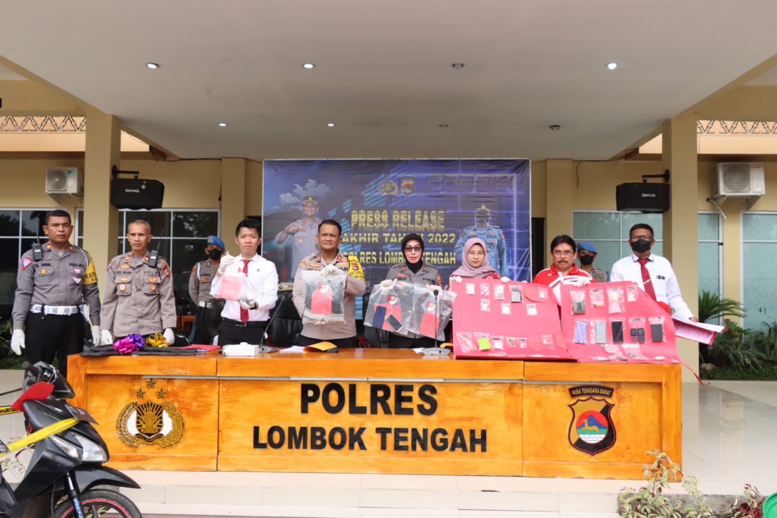 Dalam kegiatan release akhir tahun Kapolres Lombok Tengah didampingi Kasat Reskrim, Kasat Binmas, Kasi Propam, Kasi Humas, KBO Res Narkoba, KBO Sat Lantas Polres Lombok Tengah.