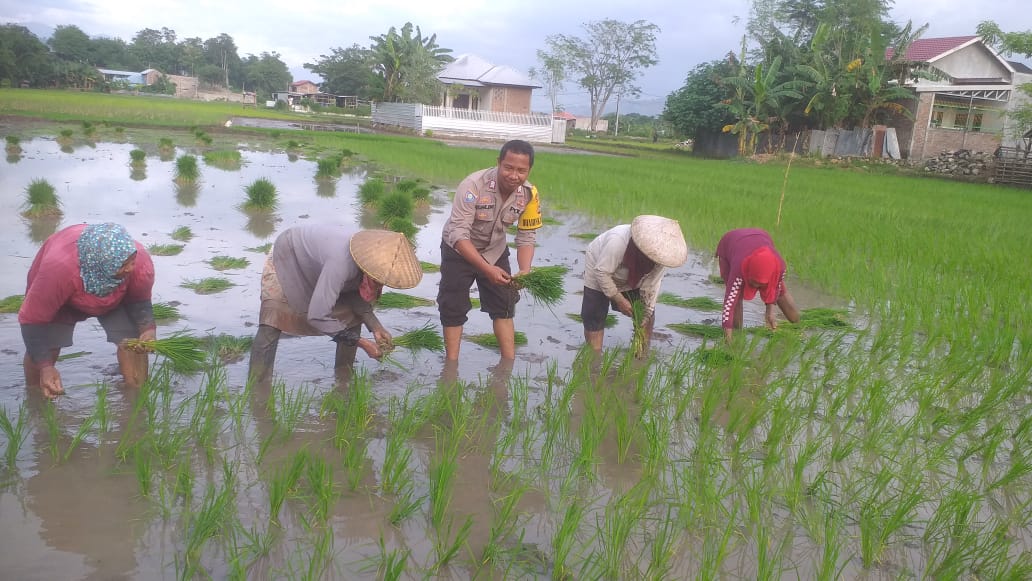 Saat geliat warga yang tengah sibuk di lahan pertanian, Bripka Muslim, tanpa ragu, turun langsung di lahan persawahan, ikut bersama para petani di wilayah binaannya, ndaut anakan padi untuk ditanam dilahan persawahan.