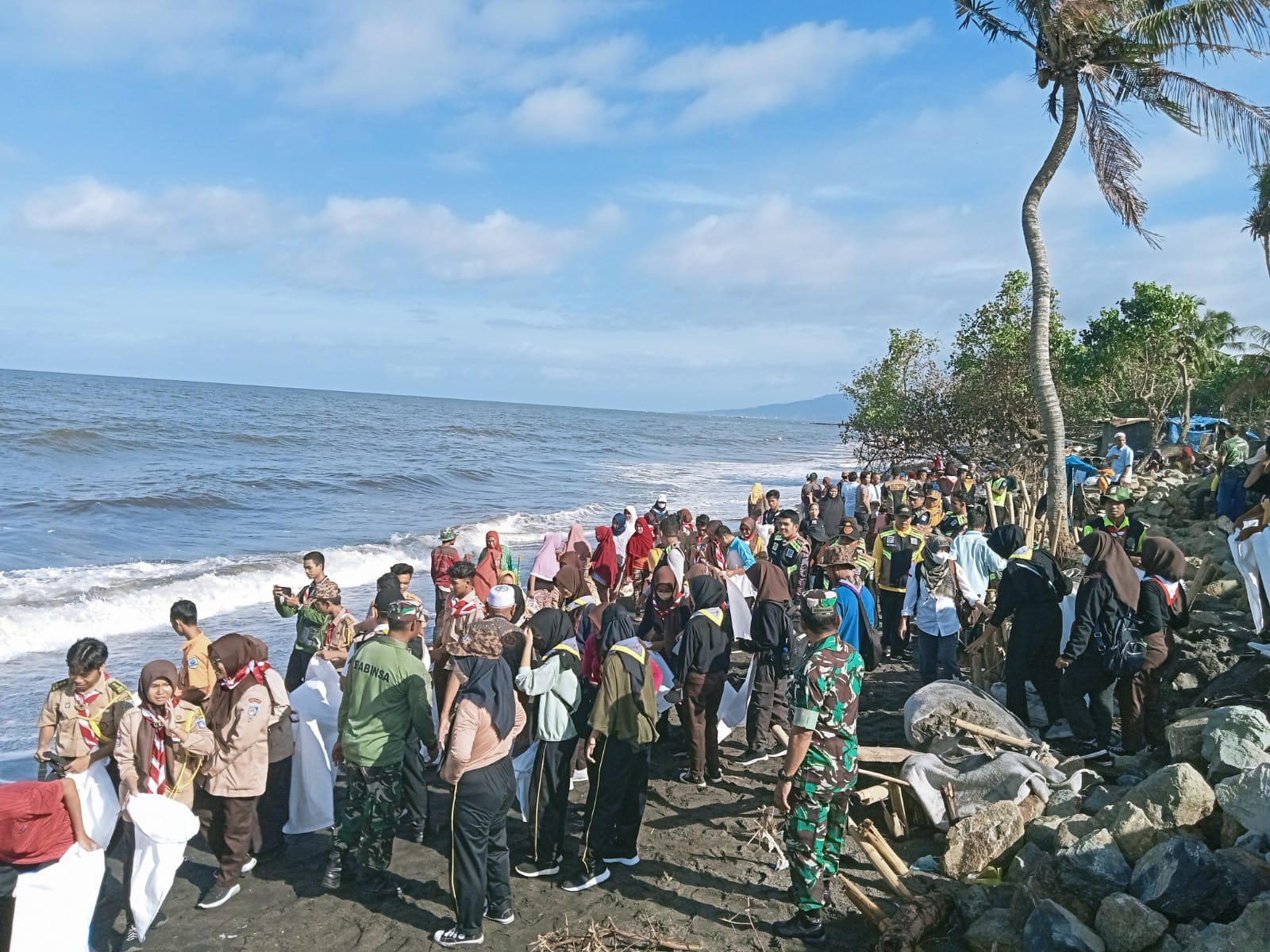 Mataram NTB – Anggota Koramil 1606-09/Ampenan bersama Linmas se-kecamatan sekarbela, Pramuka se-Kota Mataram, dan Masyarakat setempat melaksanakan gotong-royong pembersihan pantai pasca terjadinya bencana alam air laut pasang (Rob) yang merusak perumahan warga dan lapak di pantai Mapak Indah Lingkungan Mapak dan pantai Gading Lingkungan Mapak Belatung Kelurahan Jempong Baru Kec Sekarbela.(04/01/23).