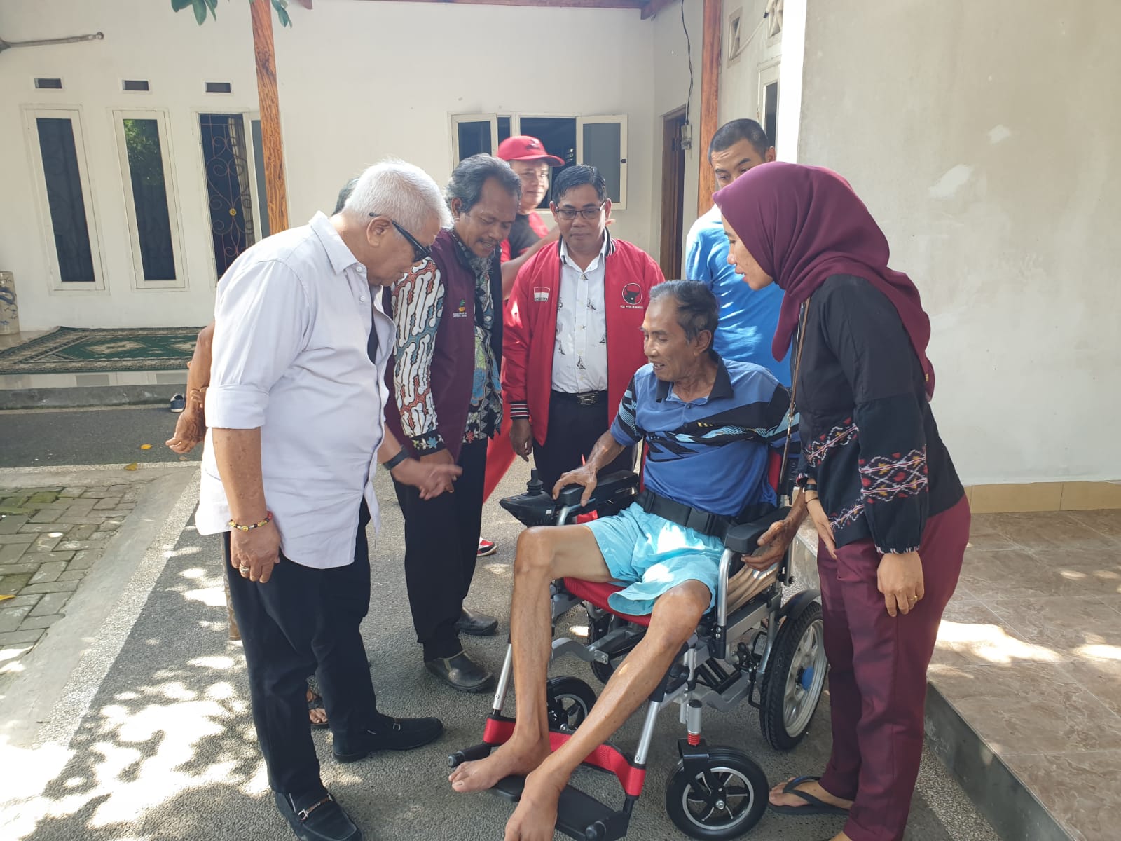 Kali ini, Rachmat membagi kursi roda terhadap mantan kepala desa Kuripan Lalu Maiwarte yang menderita stroke dan lumpuh.