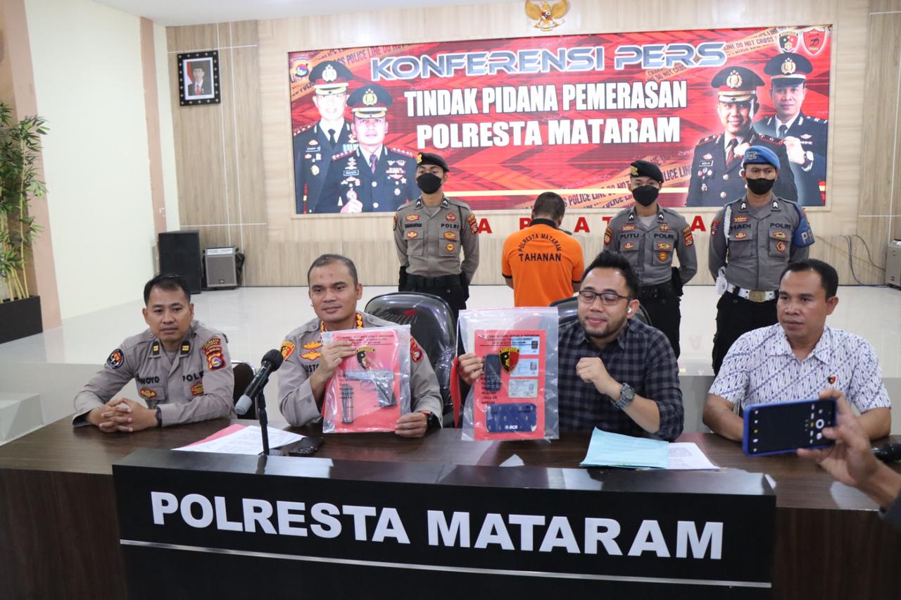 Penangkapan terduga pelaku atas laporan korban sdri. NH [ 53 ] di Polresta Mataram setelah korban merasa diintimidasi dengan melakukan pengancaman terhadap korban bila tidak segera diberikan sejumlah uang Oleh korban karena merasa takut menyerahkan sejumlah uang dan langsung melaporkan peristiwa tersebut.
