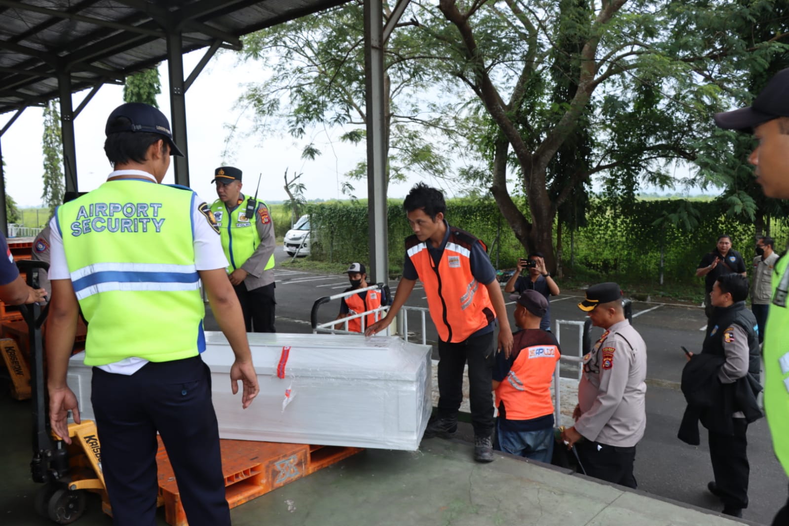 Kapolres Lombok Tengah AKBP Irfan Nurmansyah, SIK, MM melakukan pendampingan kedatangan jenazah korban meninggal akibat gempa di Negara Turki pada Kamis 23/02/2023 pukul 13.20 Wita, bertempat di Cargo Bandara Internasional Zainuddin Abdul Madjid (BIZAM).