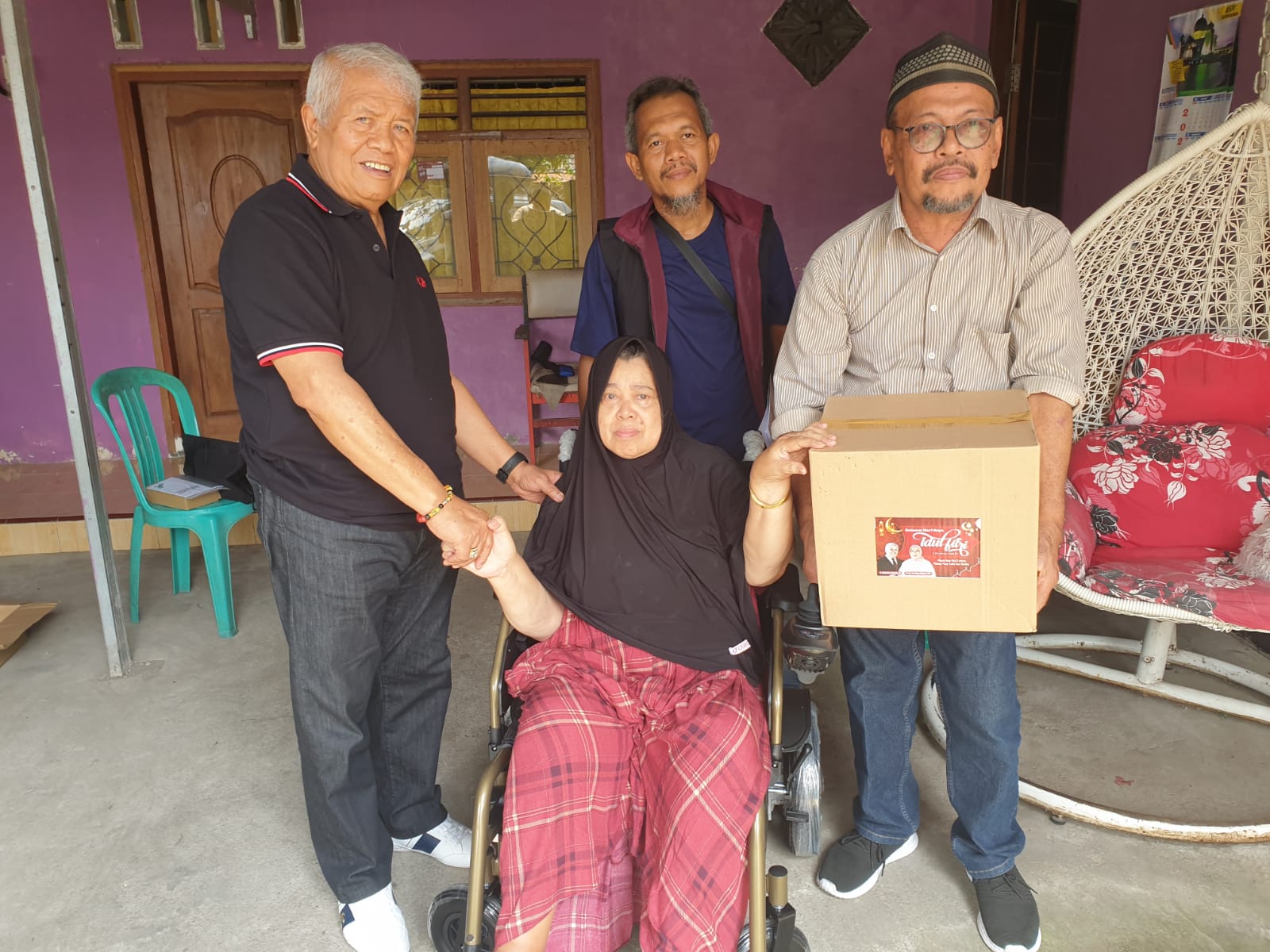 Selain bantuan kursi roda elektrik, Rachmat menyerahkan pula bingkisan untuk Idul Fitri bagi Hj Sahrun. Kepada sejumlah anak-anak Hj Sahrun, Rachmat juga menyerahkan bantuan uang untuk menghadapi Lebaran.
