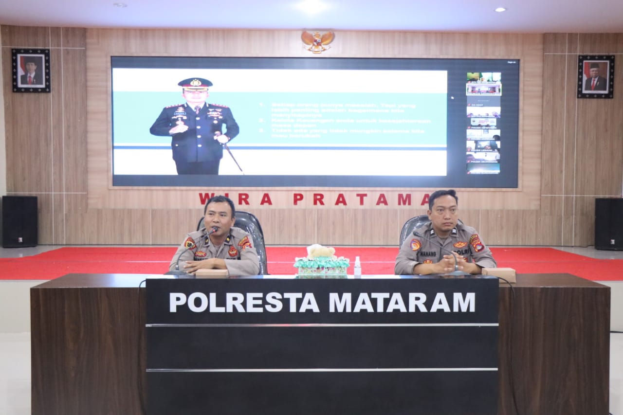 Hadir dalam kegiatan tersebut Kapolresta Mataram diwakili oleh Kabag SDM Polresta Mataram Kompol Ahmad Mansur SAg didampingi Ps. Kasubbag Binkar Iptu Ni Nyoman Sei Jayantiwati, SH, oleh Staf Bag Ren bersama 42 personel Polresta Mataram yang ditunjuk dan personel Polsek jajaran melalui zoom meeting