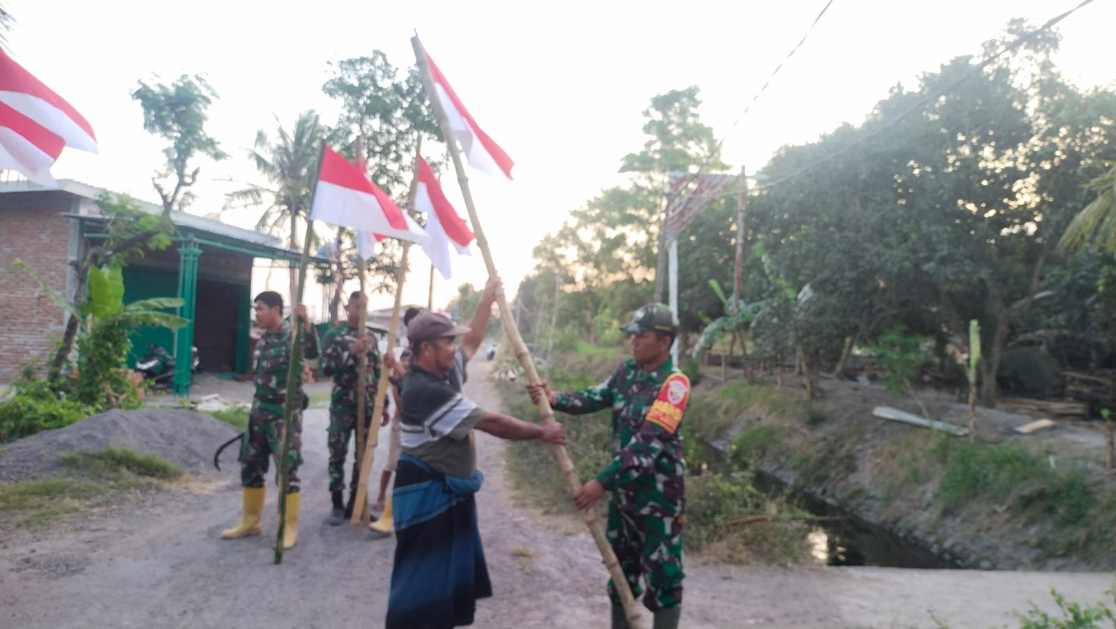 “Tak terkecuali seperti yang di lakukan oleh warga desa mujur mereka berbondong bondong bersama anggota satgas TMMD memasang bendera di jalan jalan masuk desa bahkan hingga di depan rumah masing masing,” terang Kapten Suliono.