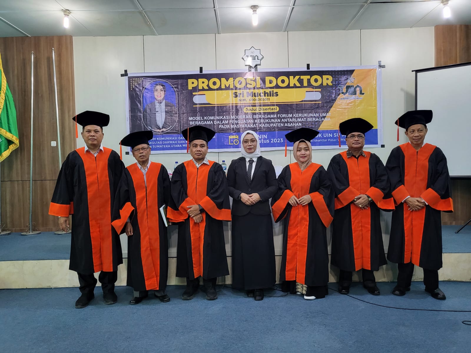 Ketua Sidang Prof. Dr. Hasan Sazali, MA menyampaikan bahwa Dr. Hj.Sri Muchlis, M. I. Kom / Ny. Sri Rusdi merupakan mahasiswi S3 FDK UINSU yang cukup aktif saat melaksanakan pembelajaran. Walaupun kondisionalnya waktu itu masih Covid, namun mahasiswi S3 kelas B Fakultas Dakwah dan Komunikasi Tahun 2020 ini bersama rekan-rekannya selalu meminta tatap muka, dengan maksud agar penyampaian yang diberikan dosen lebih dapat dimengerti dan dipahami. Hal yang sama juga disampaikan oleh promotornya, Prof. Dr. Sukiman. M. Si dan salah seorang dosen penguji Prof. Dr. Syukur Kholil, MA.
