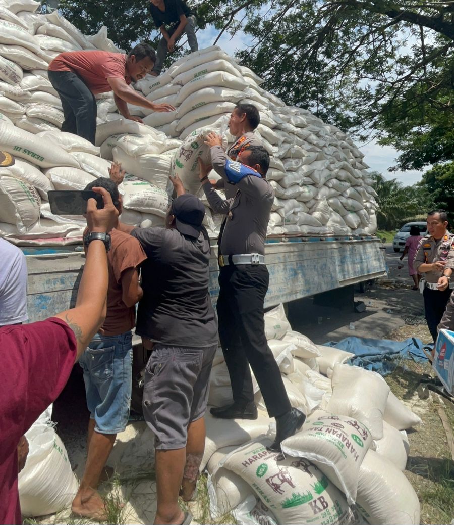 Dengan jumlah beras yang tumpah/terjatuh dari bak truk sekitar 100-200 sak beras di dalam goni ukuran 30kg.