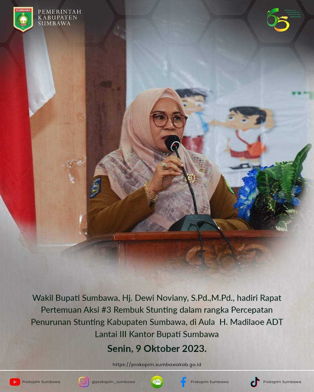 SUMBAWA, infoaktualnews.com – Wakil Bupati Sumbawa, Hj. Dewi Noviany, S.Pd.,M.Pd., hadiri Rapat Pertemuan Aksi 3 Rembuk Stunting dalam rangka Percepatan Penurunan Stunting Kabupaten Sumbawa, di Aula  H. Madilaoe ADT Lantai III Kantor Bupati Sumbawa, pada Senin, 9 Oktober 2023.