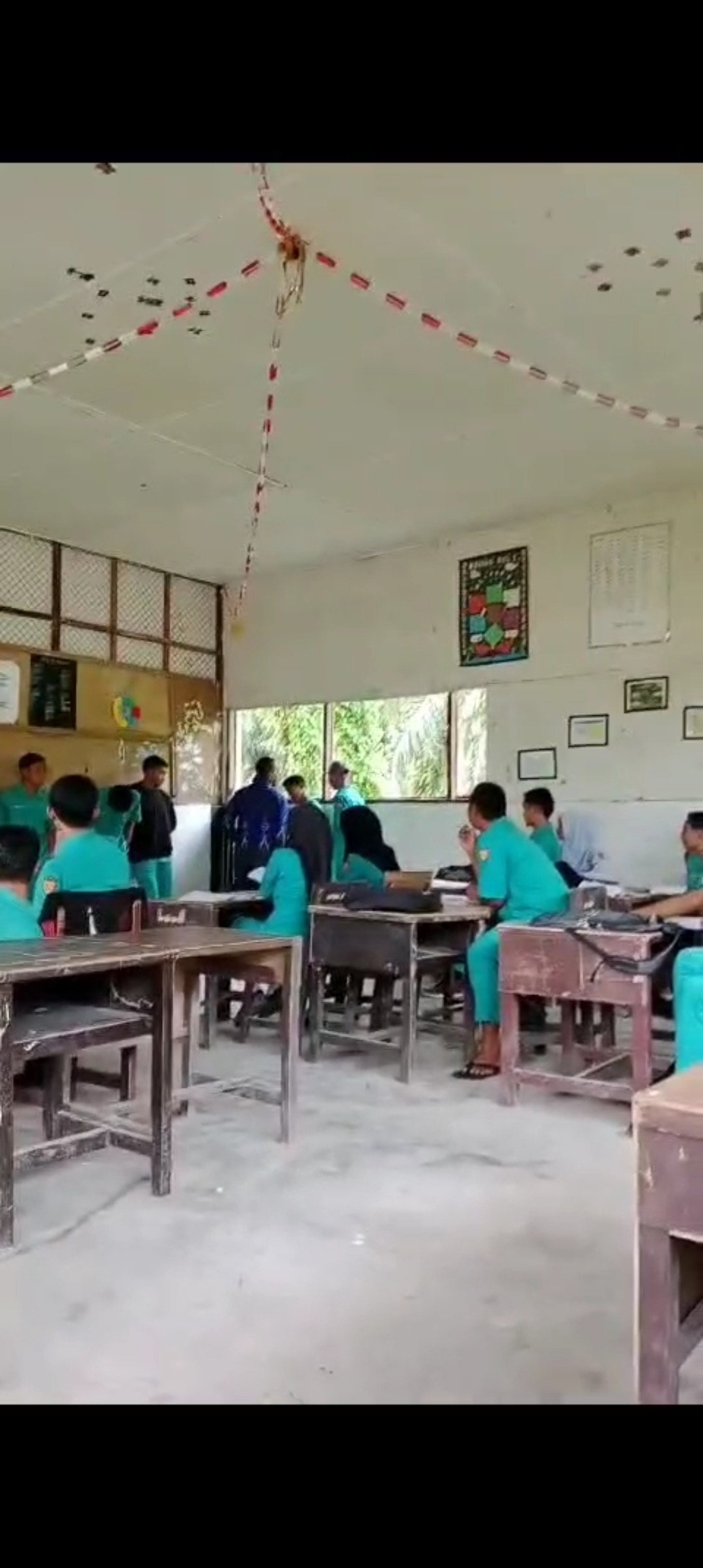 Di vidio yang berdurasi 28 detik itu memperlihat seorang pria berbaju biru diduga Kepala Sekolah menampar satu persatu siswa laki laki yang bersandar di dinding kelas, belum jelas apa motif penamparan tersebut.