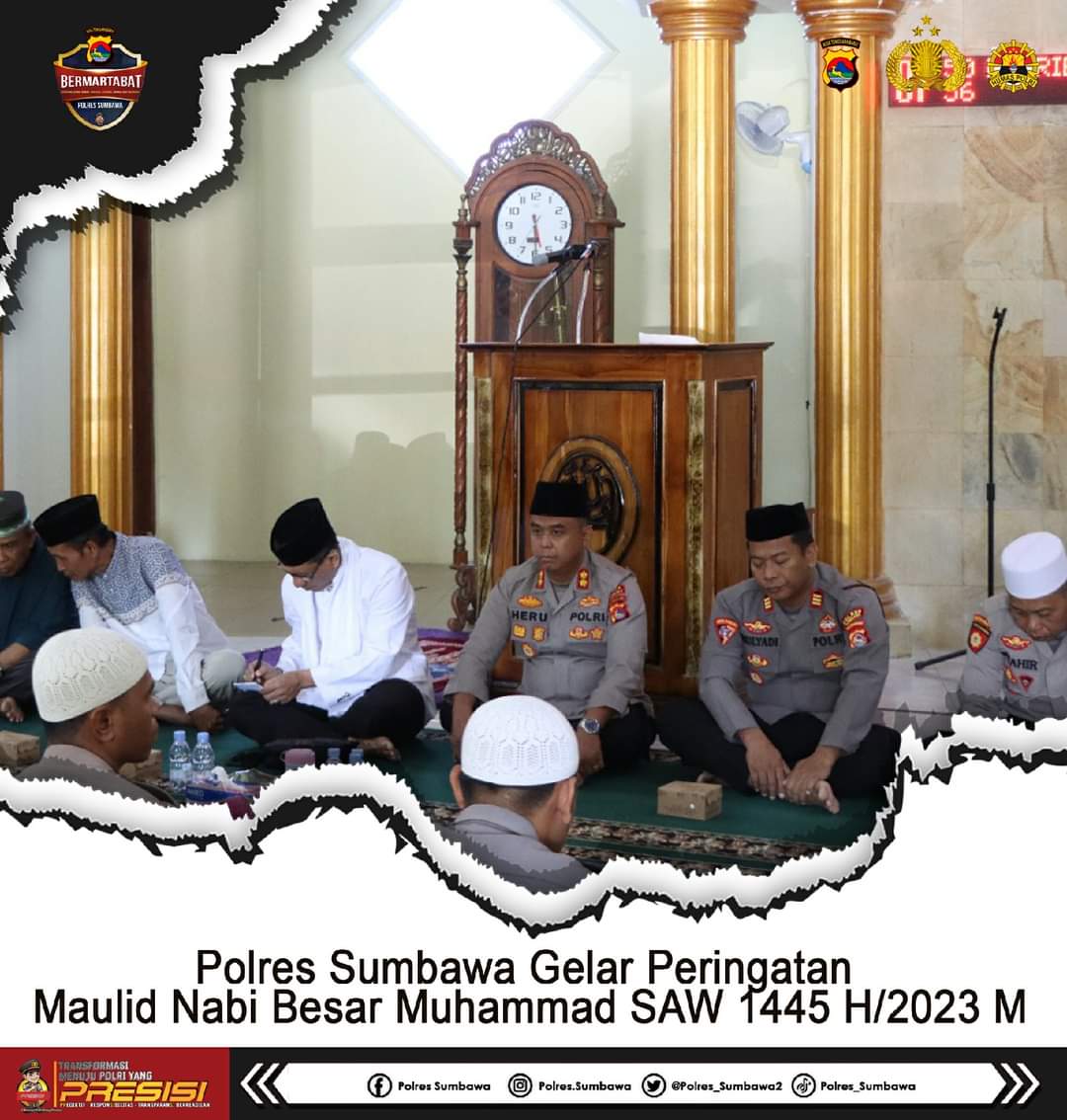 SUMBAWA, infoaktualnews.com –  Keluarga Besar Kepolisian Resor (Polres) Sumbawa Polda NTB melaksanakan kegiatan Peringatan Maulid Nabi Besar Muhammad SAW 1445 H/2023 M, yang bertemakan, ‘Dengan Meneladani Akhlak Rasulullah SAW, Kita Tingkatkan Kinerja Dengan Ikhlas dan Cerdas Guna Mewujudkan Polri Presisi Indonesia Maju’, di Masjid Bhayangkara Al-Waliyy, Sabtu (14/10/23) pagi.