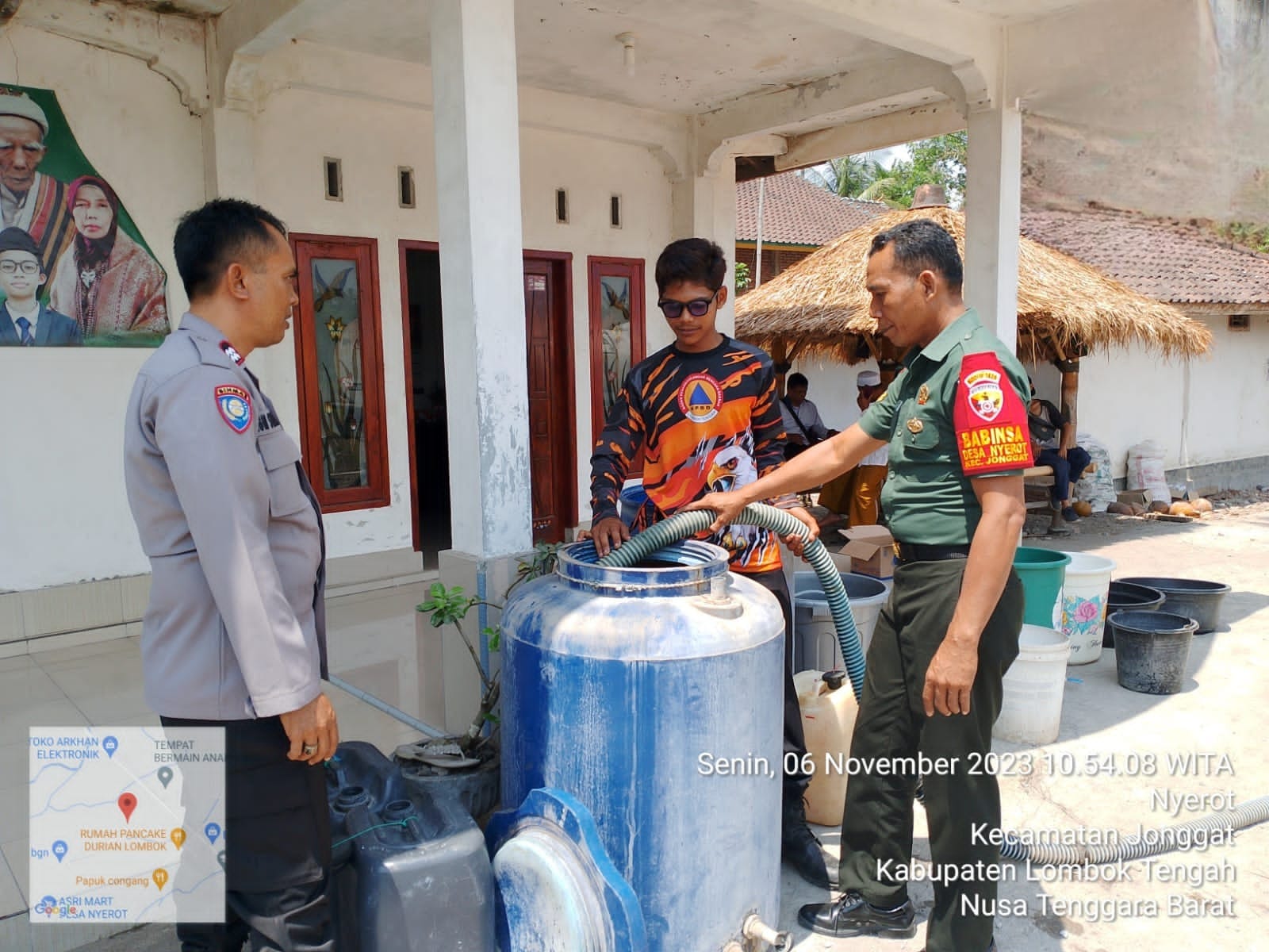 Kapolres Lombok Tengah AKBP Iwan Hidayat SIK, melalui Kapolsek Jonggat AKP Bambang Sutrisno mengatakan hari kita bersama TNI dan Pemerintah dalam hal ini koramil Jonggat dan BPBD Kabupaten Lombok Tengah menyalurkan sebanyak 5000 liter air bersih dalam rangka membantu masyarakat yang ada di desa nyerot kecamatan jonggat yang mengalami kekeringan akibat musim kemarau.