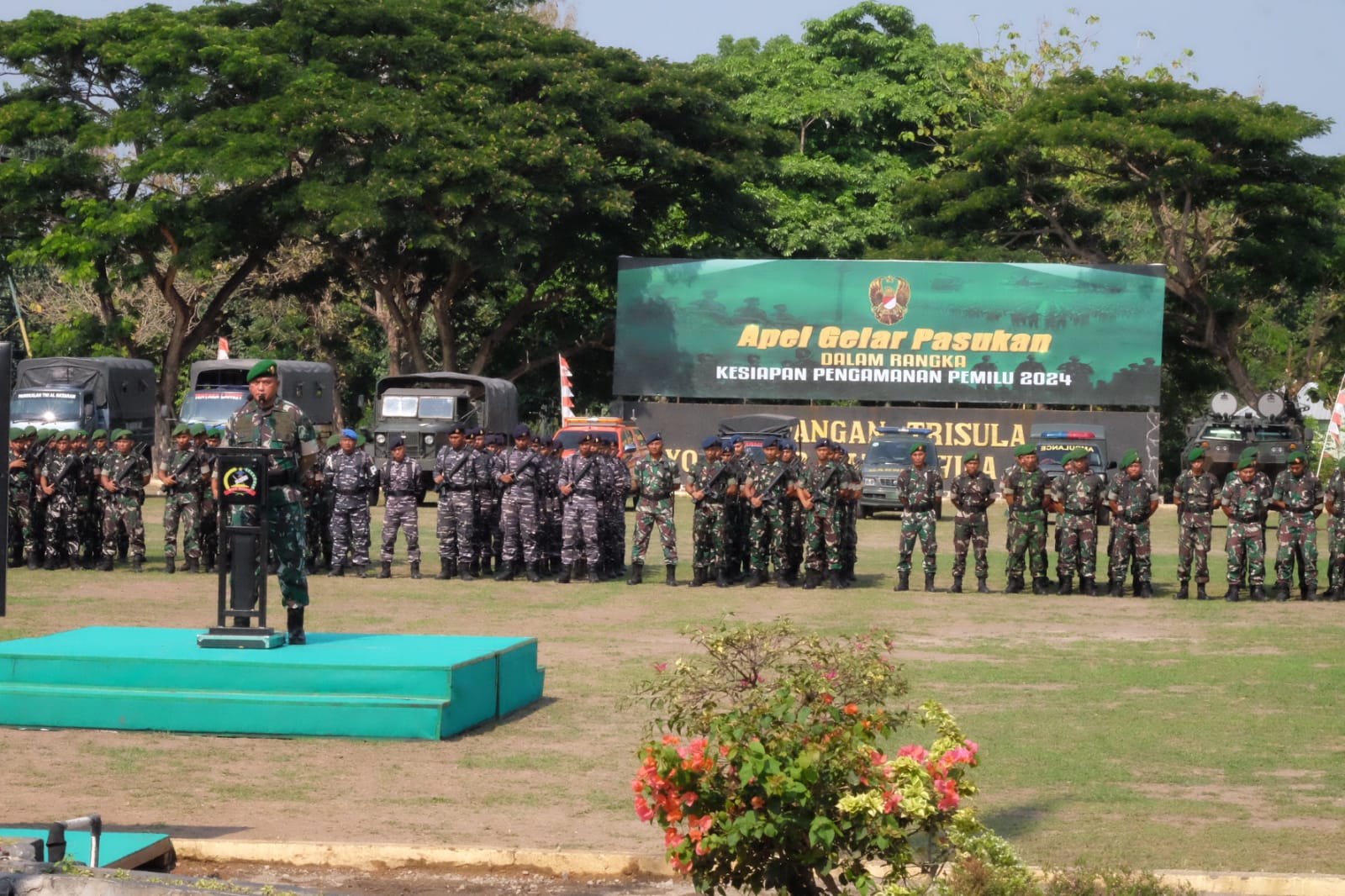 Susunan Pasukan apel gelar pasukan pengamanan Pemilu 2024 di wilayah Korem 162/WB, 1 SST Gabungan PM – TNI, 1 SSK Gabungan Pasukan Bersenjata TNI AD dan TNI AL, 2 SST Gabungan Korem 162/WB dan Balak Aju Kodam IX/Udayana, 2 SST Babinsa Kodim 1606/Mataram, 1 SST Tim Intel Korem 162/WB dan Unit Intel Kodim 1606/Mataram. (RZ*IA).