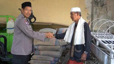Penyerahan 30 sak semen dari Kapolresta Mataram dalam hal ini diwakilkan oleh kasat Binmas AKP Maad Adnan kepada Pengurus Masjid AL-HIDAYAH Lingkungan Karang Pule Kecamatan Sekarbela Kota Mataram setelah Safari Kamtibmas dan Jumat Curhat.