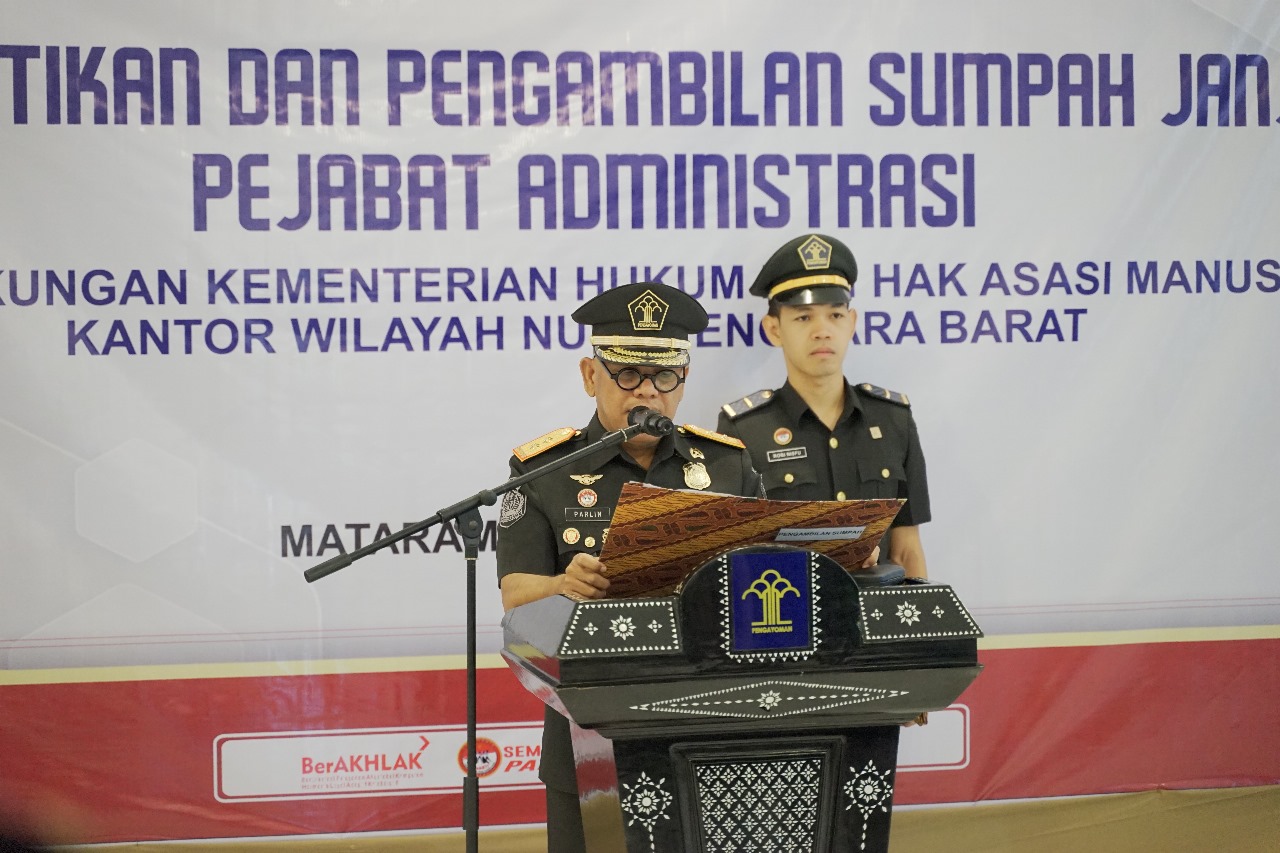 MATARAM , infoaktualnews.com _ Selamat bertugas, segera menyesuaikan diri. Berikan kontribusi terbaik bagi bangsa dan negara, khususnya melalui organisasi kita tercinta ini”, ungkap Kakanwil Kemenkumham NTB Parlindungan saat lantik dan ambil sumpah jabatan pejabat administrasi di lingkungan Kanwil Kemenkumham NTB.