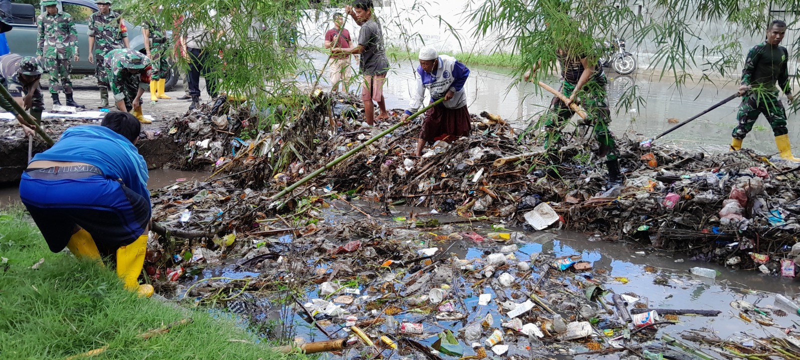 Anggota Kodim 1606/Mataram bersama warga setempat bahu membahu membersihkan saluran air, mengatasi tumpukan sampah, hingga lumpur yang terakumulasi di dalam saluran irigasi.