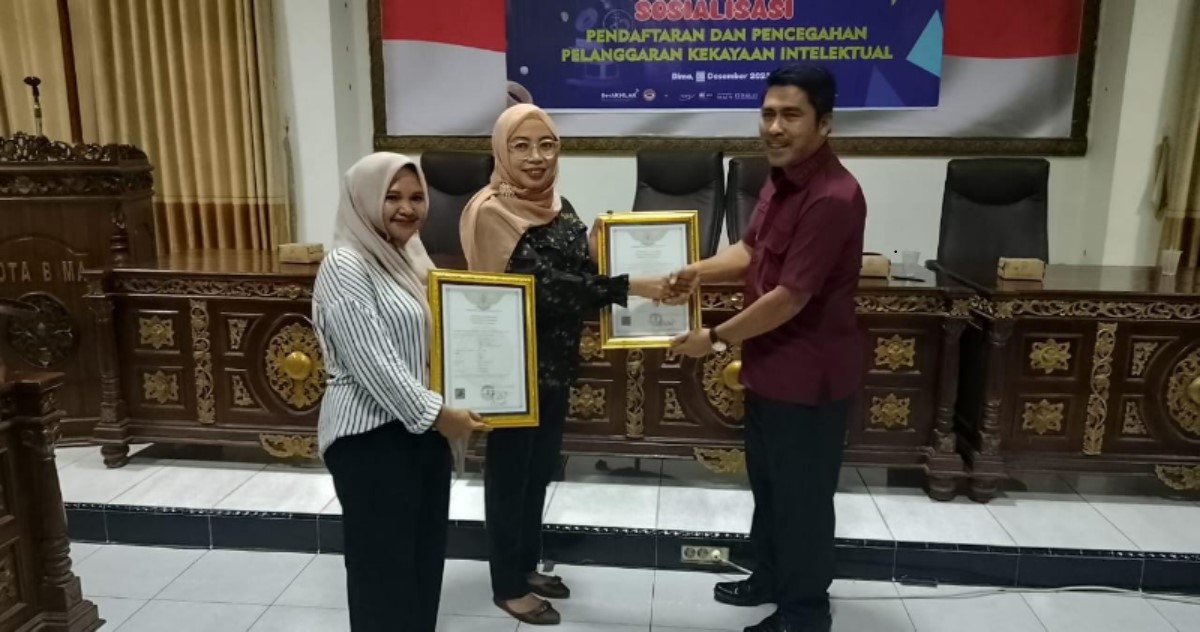 Kepala Bidang Pelayanan Hukum, Puan Rusmayadi, menyerahkan sertifikat untuk Tari Lenggo Siwe Mone dan Keris Sampari Ncuhi Dara yang berasal dari Bima.