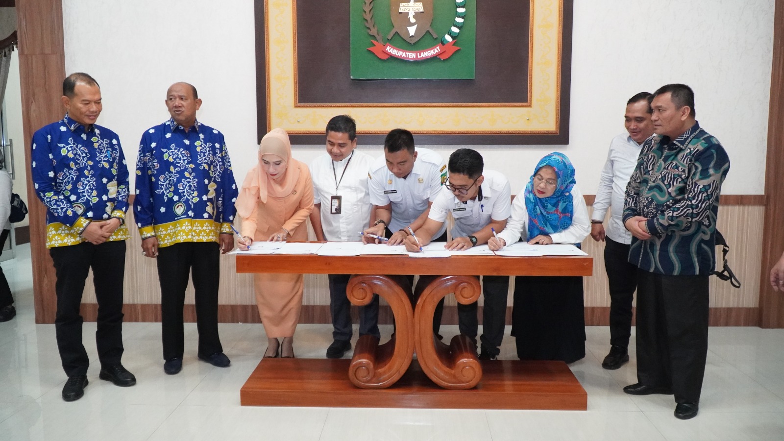 Penandatanganan MoA oleh Perwakilan Dinas sosial, Kepala Bappeda Rina Wahyuni Marpaung, S.STP, M.AP, Plt. Kabag Tapem T.Syafrie Elza Hadi Prawira, S.STP,M.AP, Kepala Dinas PMD Nuryansyah Putra, M.Si, dan Dekan Fakultas Dakwah dan Komunikasi UINSU Prof. Dr. Hassan Sazali, M.Ag disaksikan oleh Plt. Bupati Langkat dan Sekretaris Daerah Kabupaten Langkat H. Amril S.Sos, M.Ap.