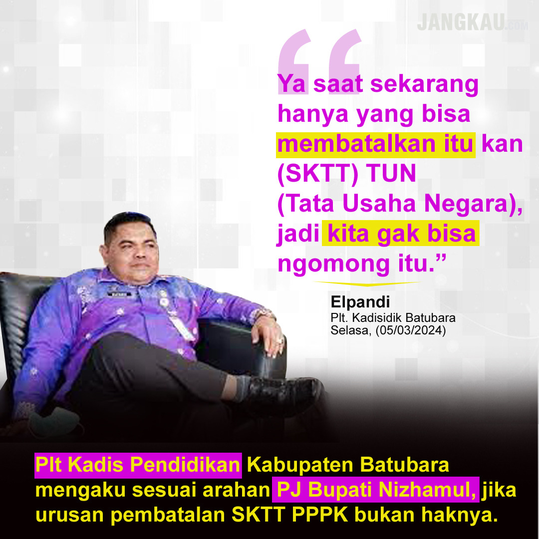 Pasalnya, Elpandi mengklaim sesuai arahan PJ Bupati Batubara Nizhamul bahwa pembatalan hasil seleksi PPPK termasuk pembatalan Seleksi Komptensi Teknis Tambahan (SKTT) bukan wewenang Pemkab.