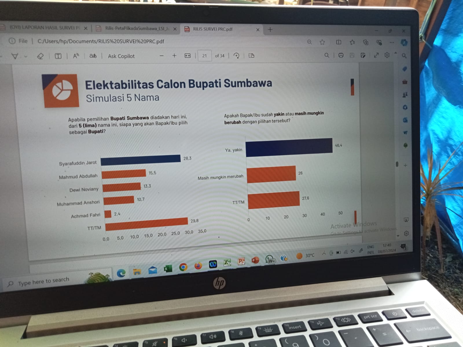 Menurutnya, survei mulai dilakukan pada tanggal 11 Juni sampai dengan 17 Juni dengan tingkat kepercayaan 95 posen dan Sempel 420 tersebar secara proporsional di 24 kecamatan se-kabupaten Sumbawa.