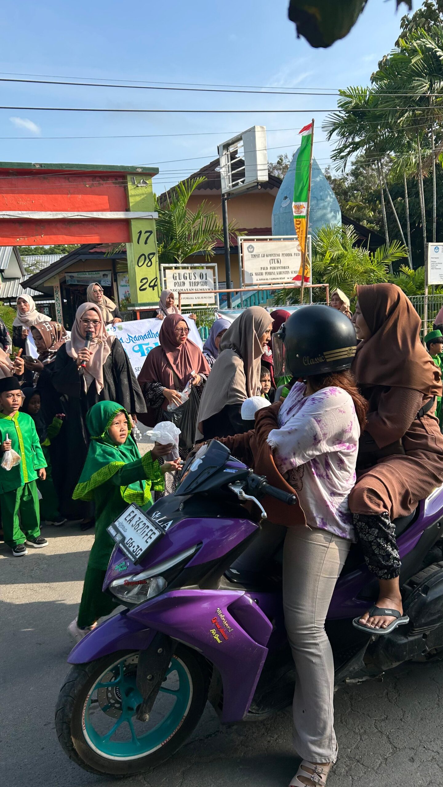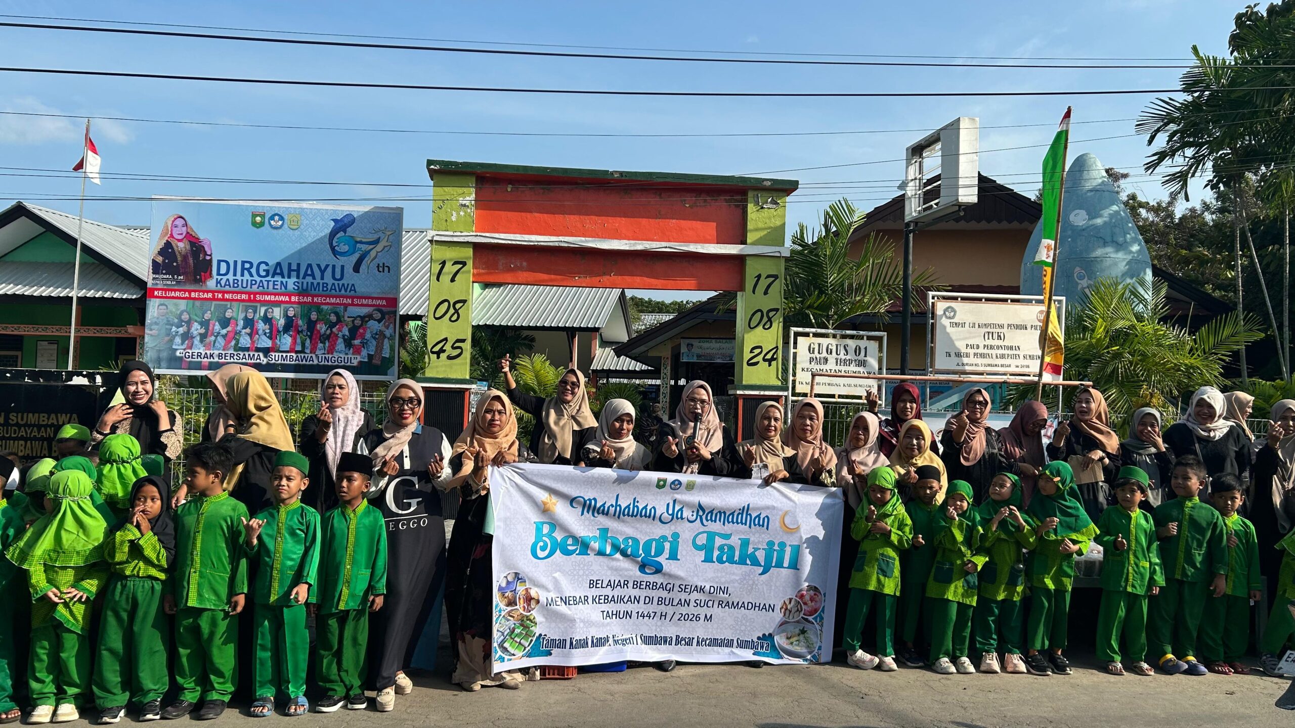 SUMBAWA, infoaktualnews.com – Suasana sore di depan TK Negeri 1 Sumbawa Besar tampak berbeda pada momentum Ramadhan 1447 H/2026. Di tengah hangatnya cahaya senja dan lalu lalang masyarakat yang hendak berbuka puasa, puluhan tangan kecil dengan wajah ceria berdiri rapi membagikan paket takjil kepada para pengendara dan pejalan kaki yang melintas.