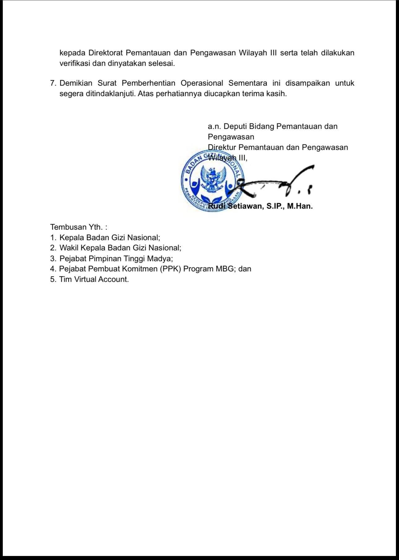Surat ini ditandatangani oleh Direktur Pemantauan dan Pengawasan Wilayah III, Rudi Setiawan, S.IP., M.Han., atas nama Deputi Bidang Pemantauan dan Pengawasan Badan Gizi Nasional.